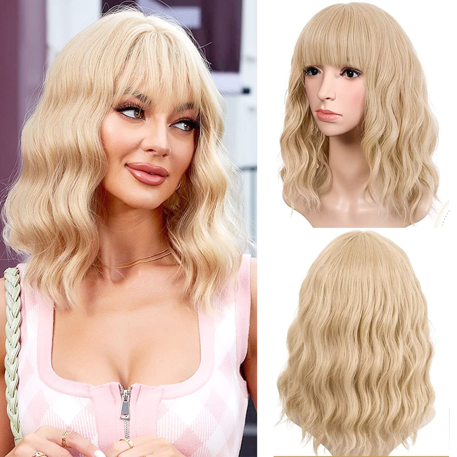 Amazon Com Kreesi Blonde Wavy Bob Wig With Bangs 14 Inch Shoulder Length Short Blonde Wigs For Women Heat Resistant Firber Synthetic Wigs Blonde Curly Wavy Wigs Girl S Cosplay Party Wig